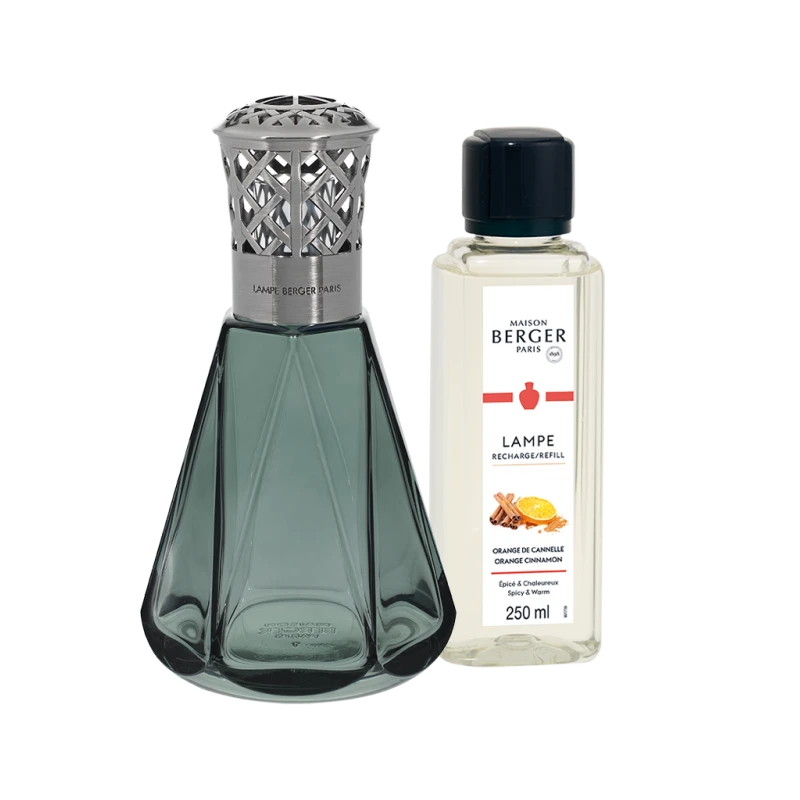 COFFRET LAMPE BERGER PYRAMIDE VERT ANTIQUE ET SA FRAGRANCE ORANGE DE CANNELLE